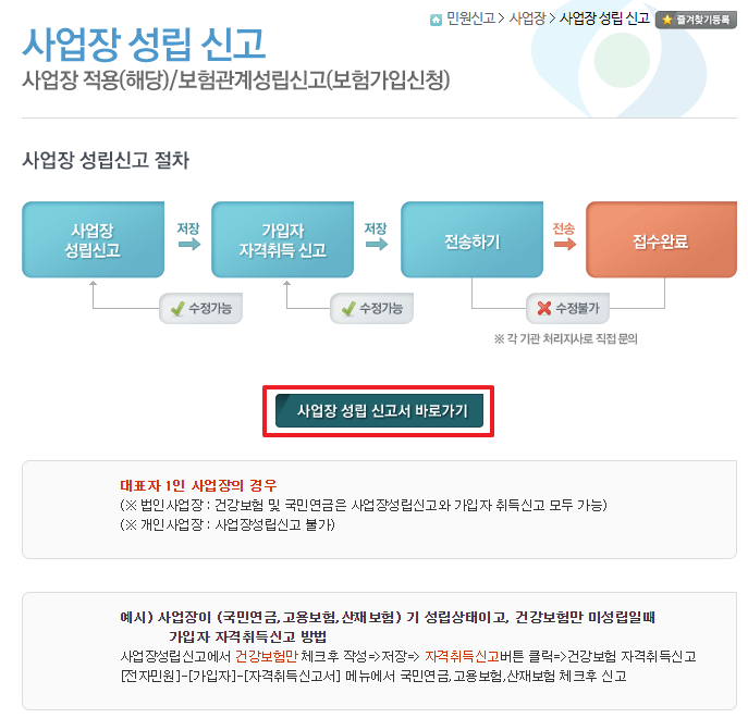 로그인 후에 사업장 성립 신고서 바로가기 누르면 진행됩니다.