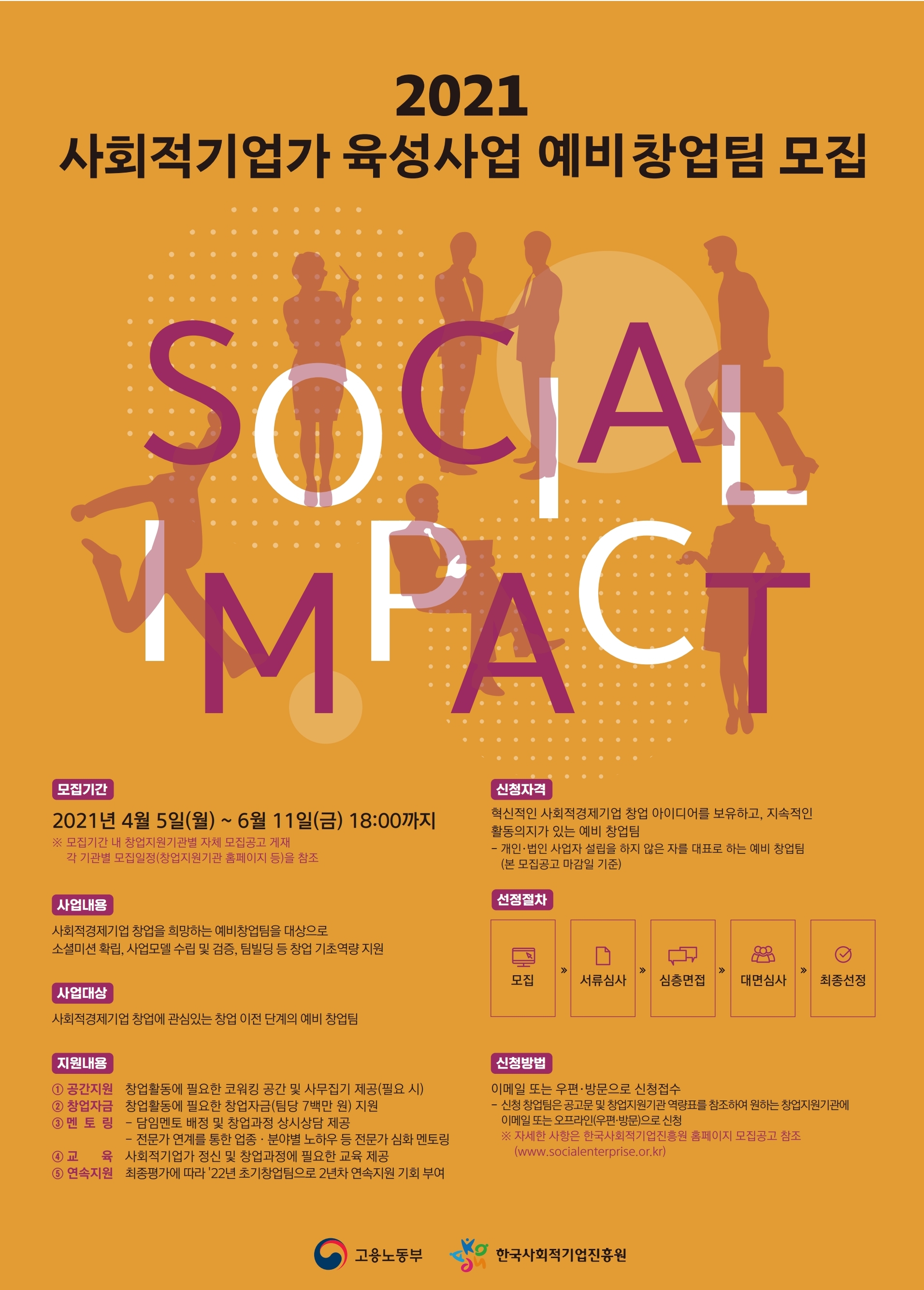 한국사회적기업진흥원에서 2021년도 사회적기업가 육성사업 창업팀을 모집하고 있으니, 관심있는 분들의 많은 참여 바랍니다.