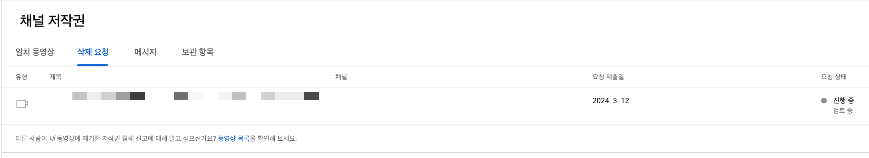 신청서 제출을 하고 나면 이렇게 유튜브 채널 크리에이터 스튜디오에서 삭제요청 진행사항을 확인할 수 있습니다. 검토상태는 지금 검토중이라고 뜨네요. 그리고 채 하루도 지나지 않아 조치가 완료됐다고 메일이 왔네요.