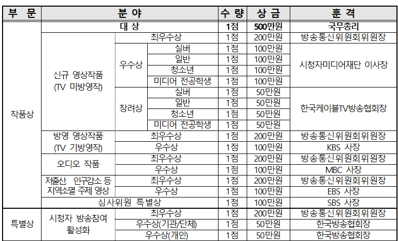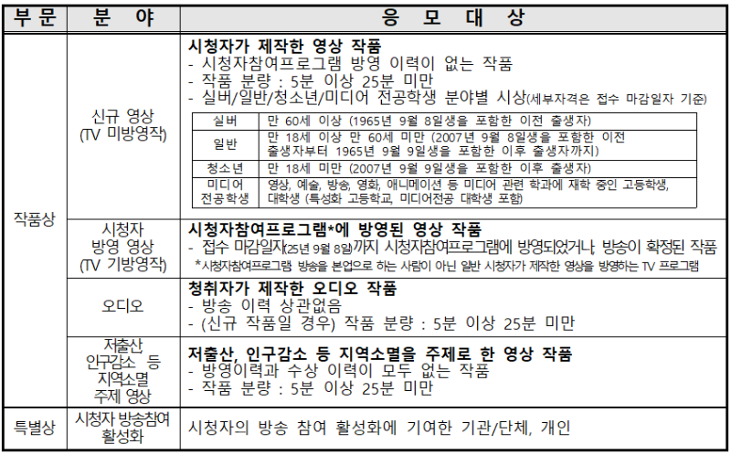 o (공모목적) 시청자가 제작한 창의적인 작품 발굴 및 홍보, 시청자의 방송참여 활성화에 기여한 개인 및 단체 격려