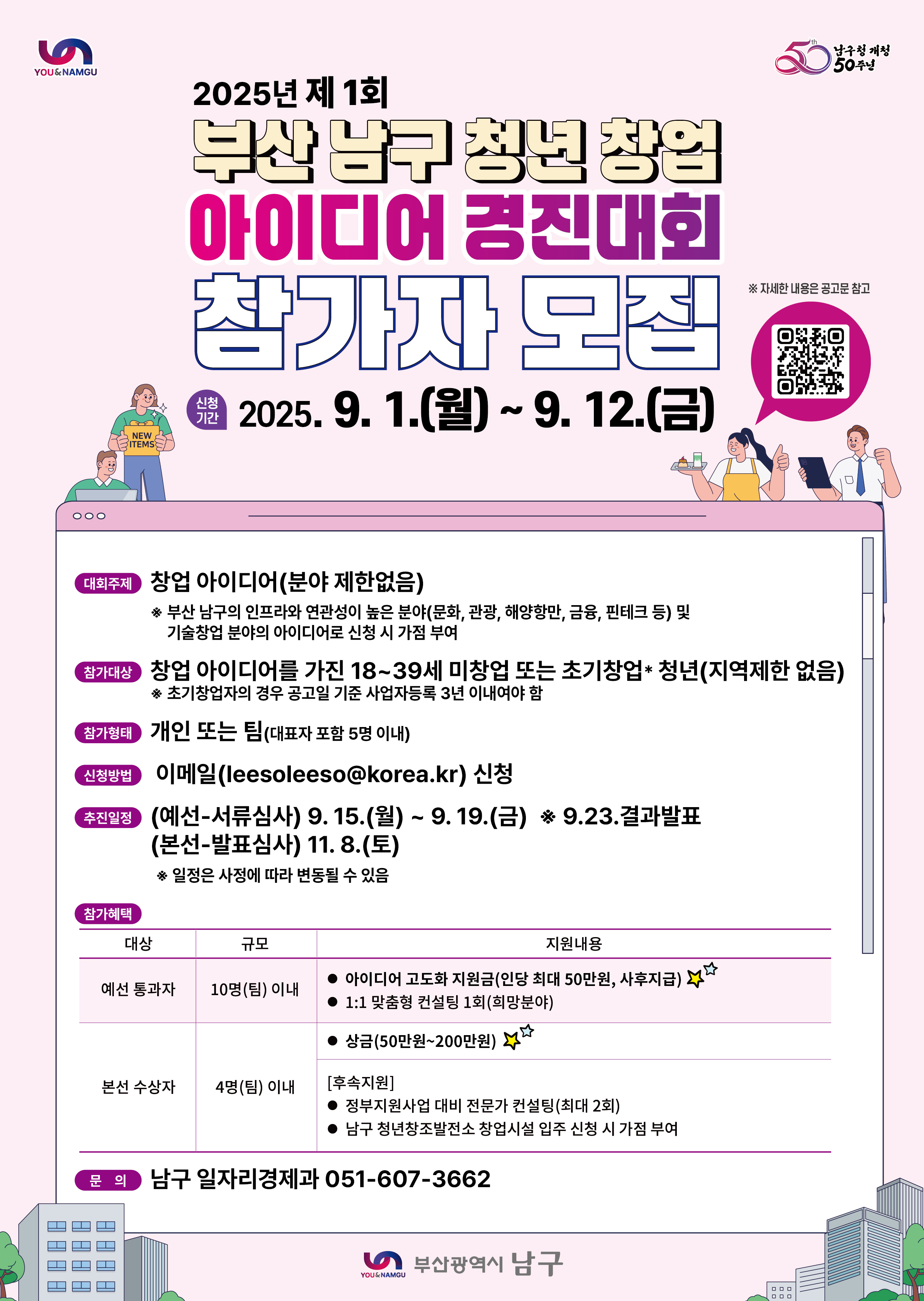 초기 창업 아이디어를 가진 청년들이 아이디어를 실험하고 다듬을 수 있는 기회를 제공하고자 제1회 부산 남구 청년 창업 아이디어 경진대회를 다음과 같이 개최하니 창업에 관심 있는 청년들의 많은 참여 바랍니다.