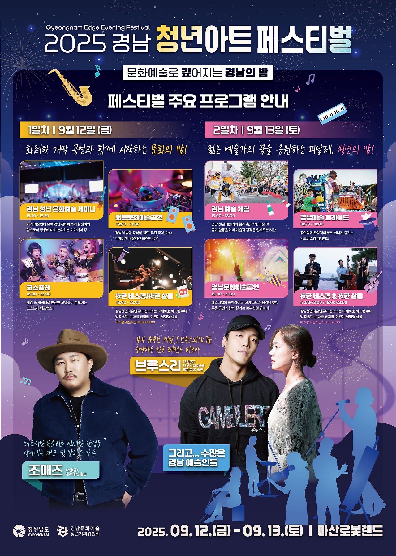 ㅇ1일차 9월12일(금) : 경남 청년 문화예술 세미나(15:30 ~ 18:30), 젊은문화 예술공연(19:00 ~ 21:00)