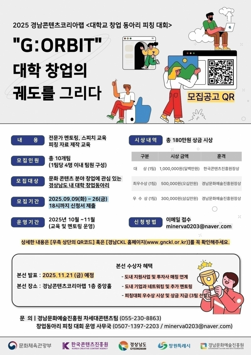 (재)경남문화예술진흥원 경남콘텐츠코리아랩은 도내 대학생 콘텐츠 창업 아이디어 발굴 및 창업 의식 고취를 위해 「대학교 창업동아리 피칭 대회」프로그램 참가자를 아래와 같이 모집하오니 많은 관심과 참여 바랍니다.