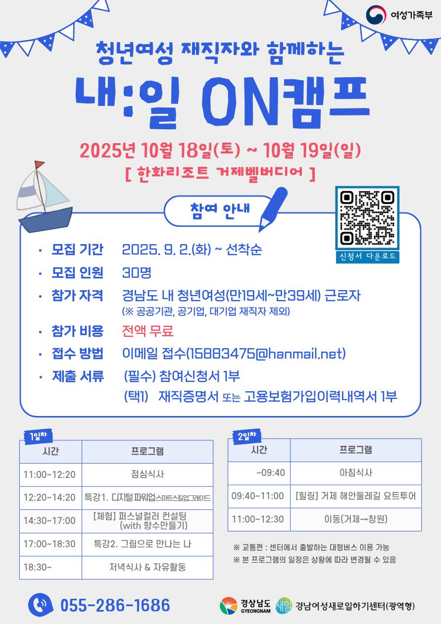 「내:일(JOB) ON캠프」의 참여자를 모집하오니, 청년여성 근로자들의 많은 참여 바랍니다.