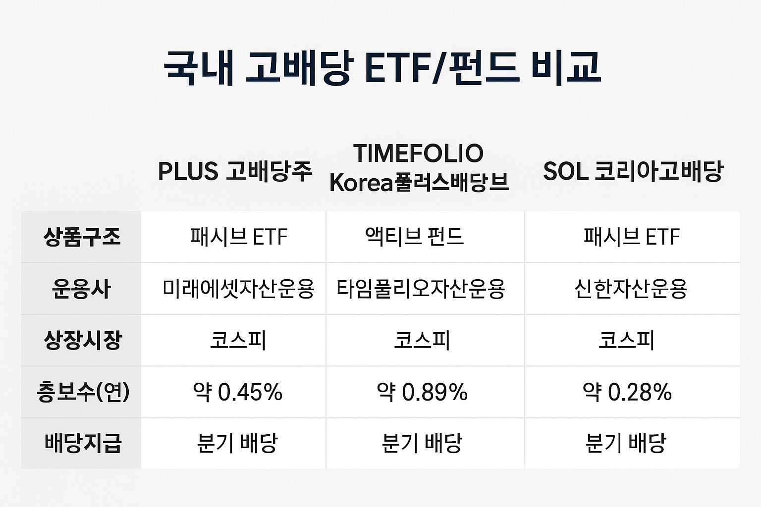 - PLUS 고배당주 / SOL 코리아고배당 → 지수 기반, 금융·통신·에너지 중심의 안정적 고배당주 비중.