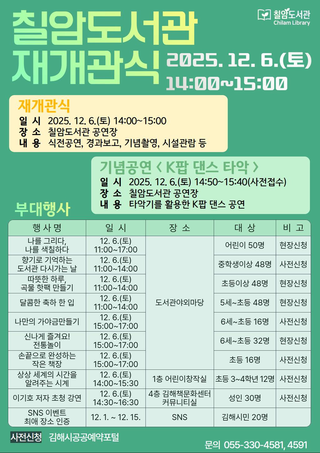새롭게 탈바꿈한 칠암도서관 재개관을 함께 축하하며, 재개관식을 즐겨보아요!