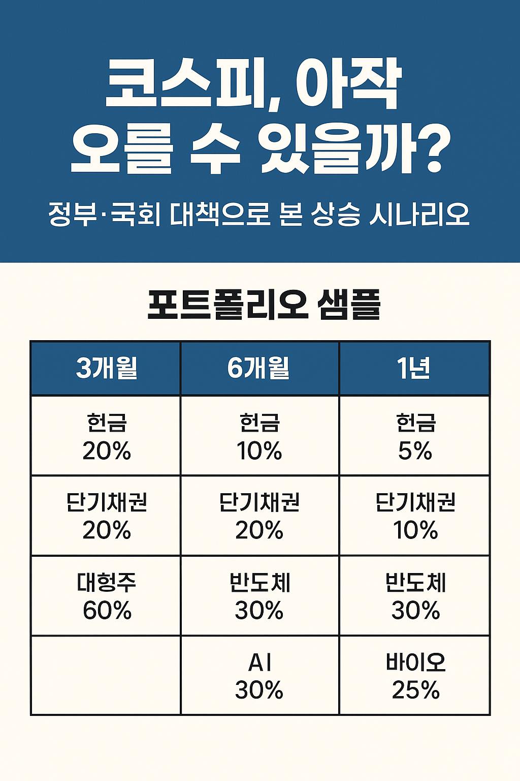 - 리스크 분산: 코스닥·중소형 성장주(정책적 수혜 기대) 일부와 안전자산(단기채·현금) 병행.