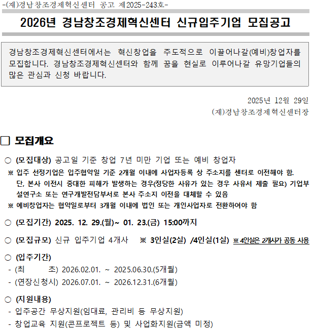 | 2026년 경상남도 창업보육센터 입주기업 모집 공고 (0) | 2025.12.29 |