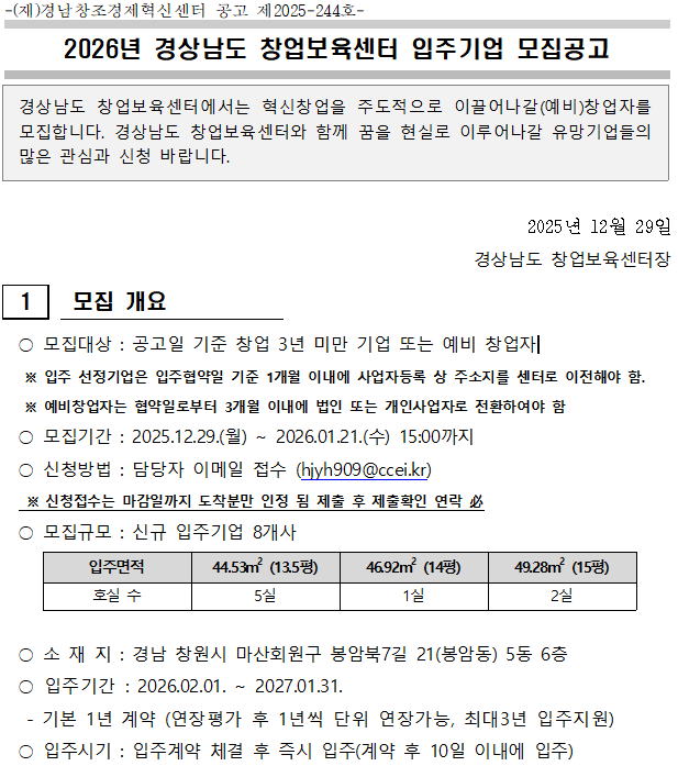 | 2026년 경남창조경제혁신센터 혁신BI 입주기업 모집 공고 (0) | 2025.12.29 |