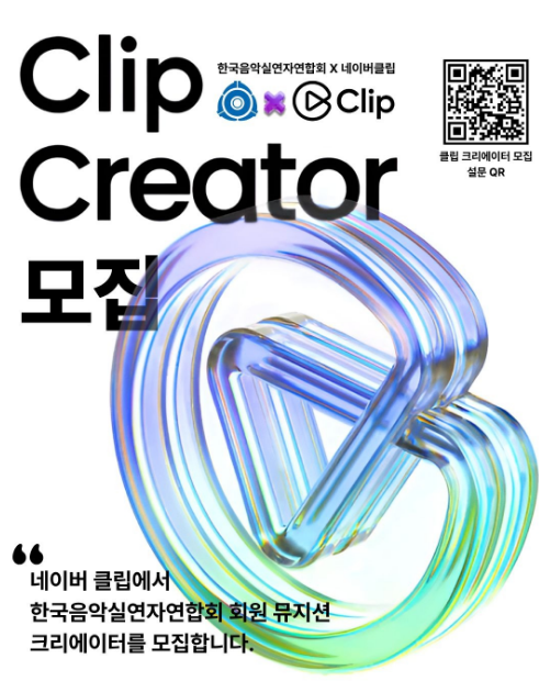 한국음악실연자연합회는 회원 여러분의 창작 활동 영역 확대와 온라인 홍보 강화를 지원하기 위해, 네이버의 숏폼 영상 서비스 ‘네이버 클립’과 연계한 크리에이터 참여 기회를 안내 드립니다.