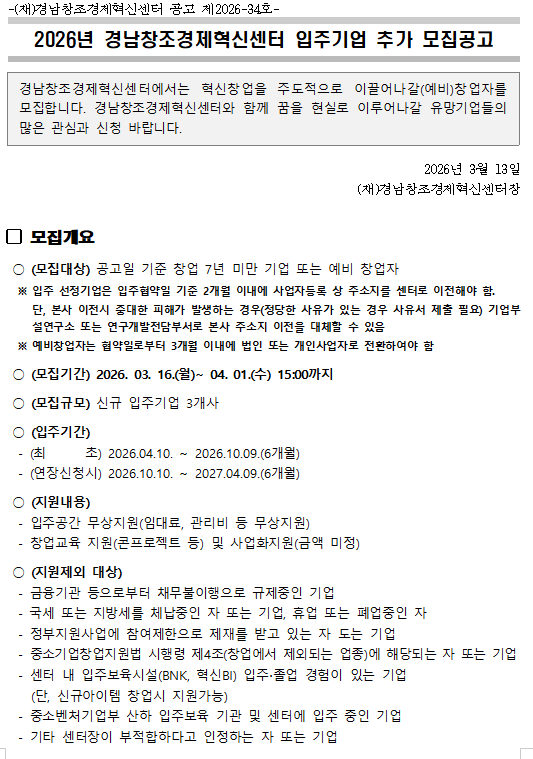 | 경상남도창업보육센터 입주기업 모집공고(봉암동) (0) | 2026.03.24 |