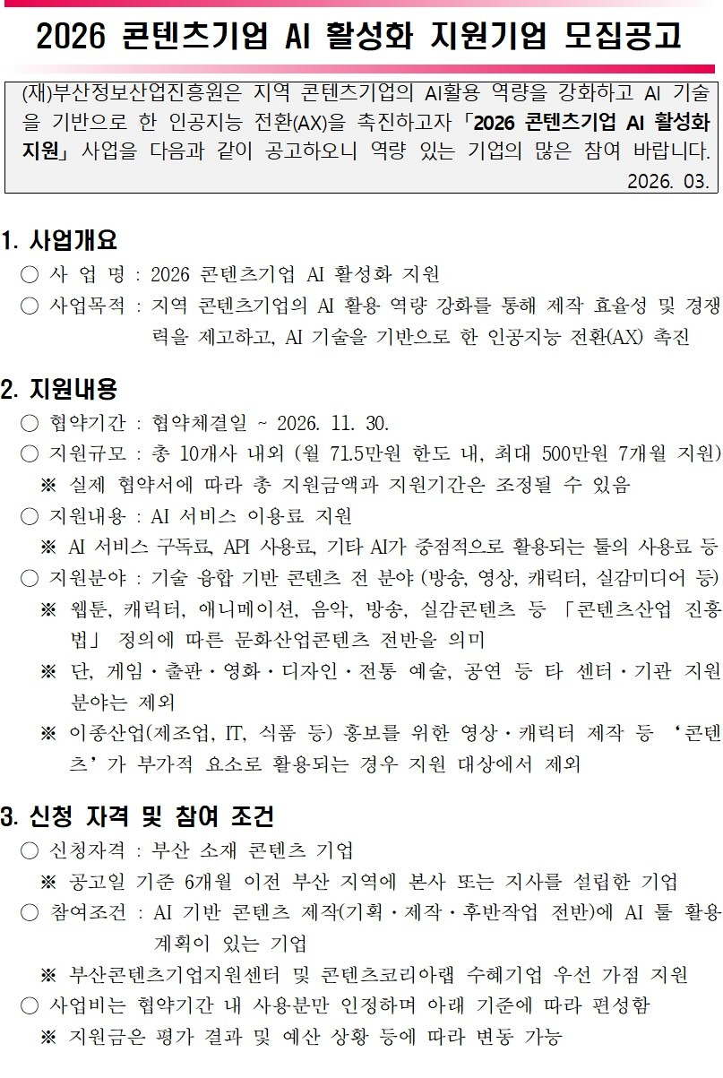 | 2026 성장형 AIㆍ신기술 글로벌 영상 콘텐츠 제작지원 모집공고 (0) | 2026.03.24 |
